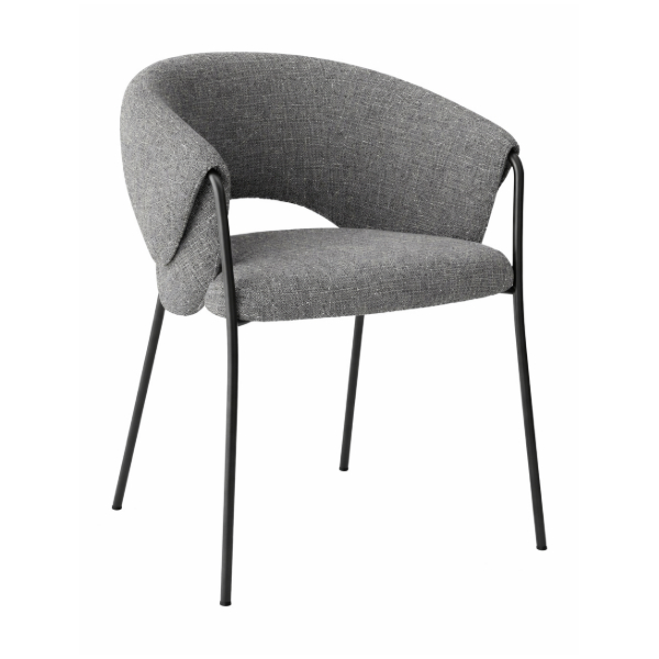 This contemporary dining chair features a curved upholstered back and cushioned seat, supported by a slim metal frame for a clean, modern finish. Ideal for restaurant dining areas, hotel dining spaces, and commercial interiors, it offers comfort, durability, and style suited to high-quality contract furniture projects.